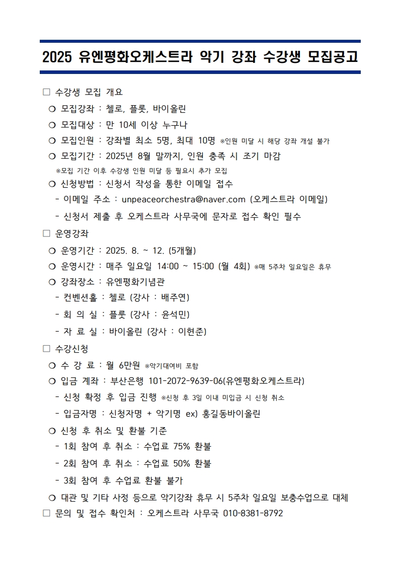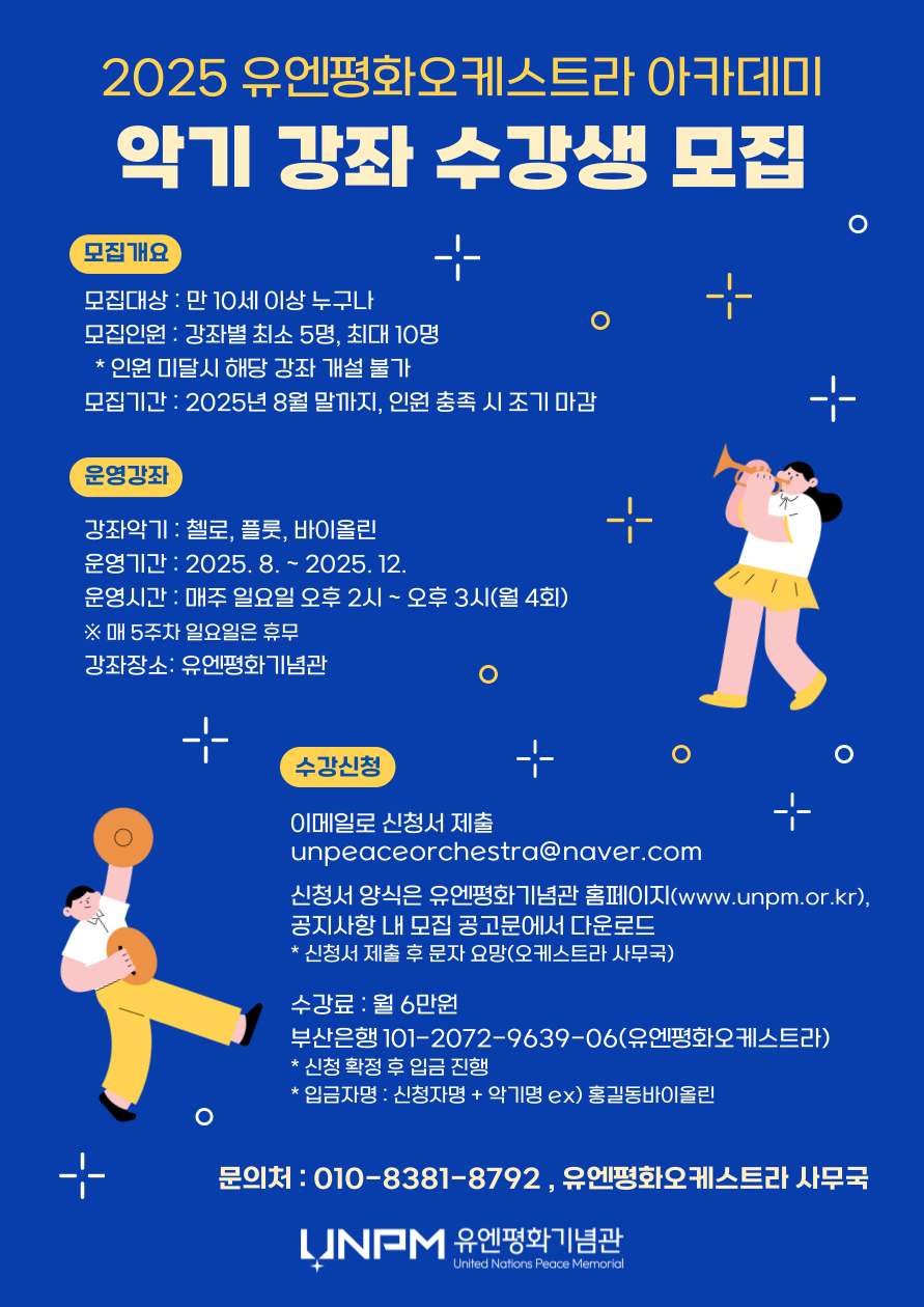 [문화예술단체] 2025 유엔평화오케스트라 아카데미 악기 강좌 수강생 모집
