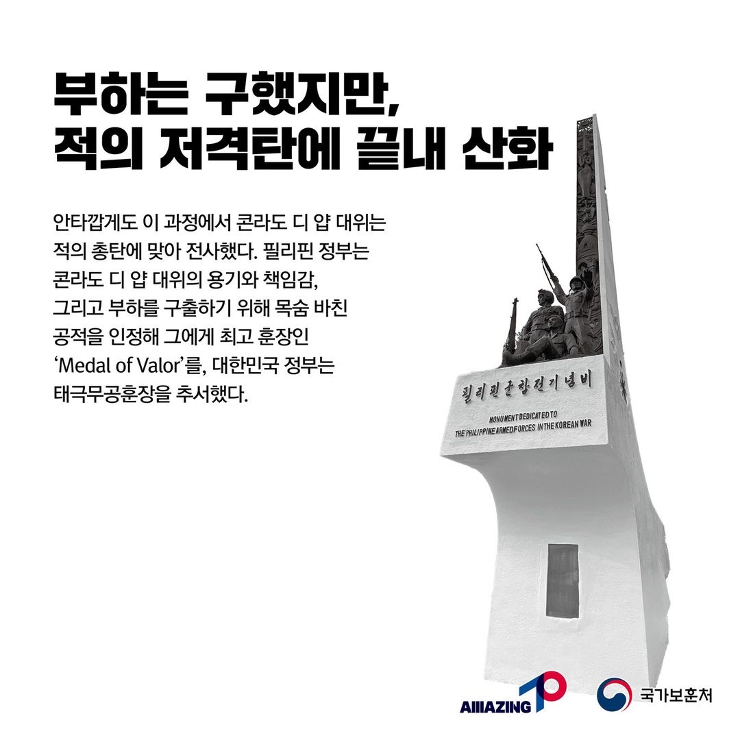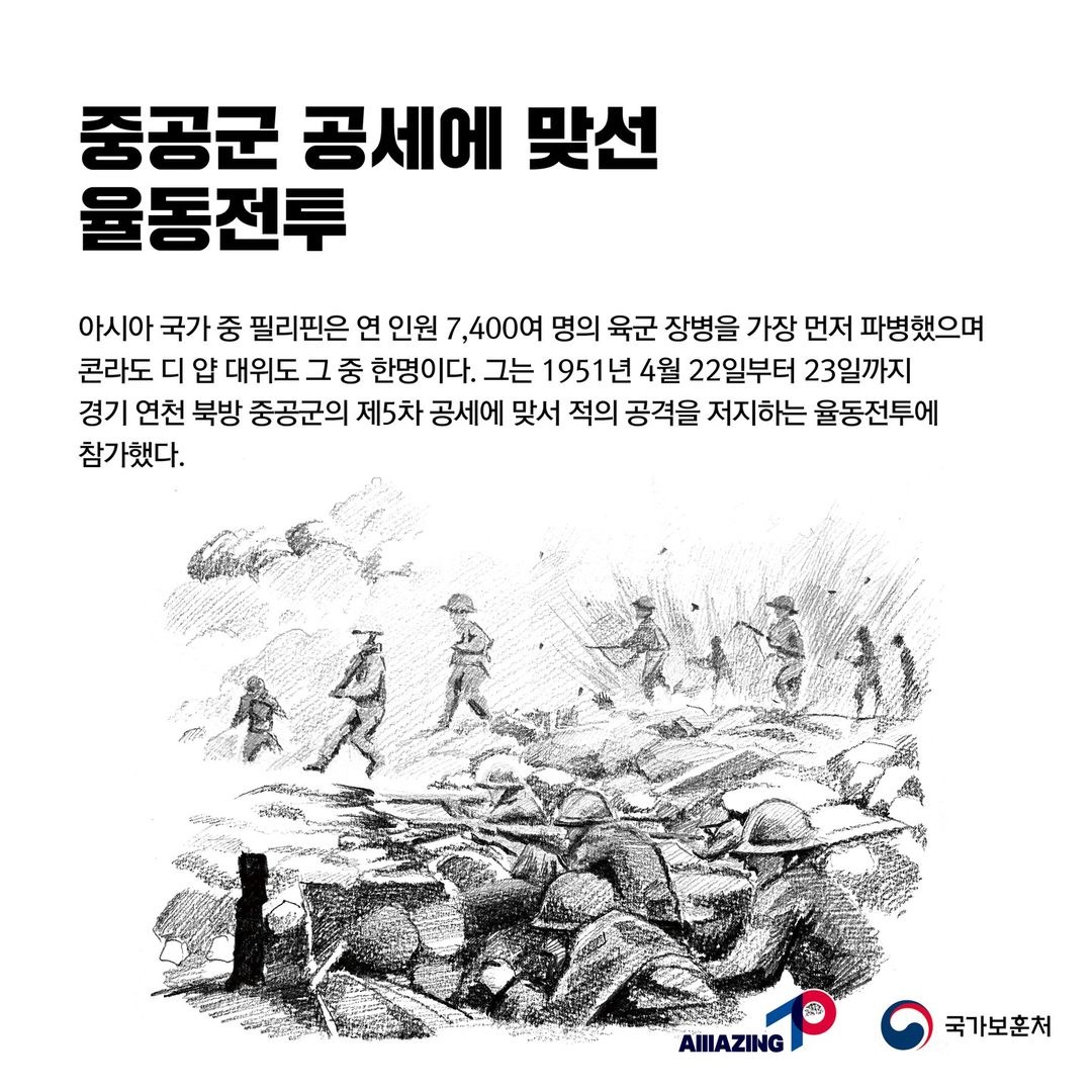 4월 마지막,<부하를 구하고 하늘로 떠난 의로운 군인 : 필리핀 육군 대위 콘라도 디 얍> 입니다. 아시아 국가 중 필리핀은 육군장병을 가장 먼저 파병한 국가로 콘라도 디얍 대위는 1951년 4월 22일부터 23일까지 중공군의 제5차 공세에 맞서 적의 공격을 저지하는 율동전투에 참가하였습니다. 콘다로 디 얍 대위는 퇴로 차단의 위기에서 방어전을 전개하던 중 대대장으로부터 즉각 철수할 것을 지시 받았으나, 생존자를 구출하고 전우들의 시체를 수습한 후 철수하겠다며 역습을 감행합니다. 부상을 입은 동료 2명을 구출하고 전사한 부대원들의 시체를 수습하며 적 고지 탈환까지 성공하게 됩니다. 하지만 안타깝게도 콘라도 디 얍 대위는, 적의 총탄에 맞아 전사하게 되고 필리핀 정부와 대한민국 정부는 그의 용기와 책임감, 부하를 구출하기 위해 목숨바친 공적을 인정해 'Medalof Valor', '태극무공훈장'을 추서하였습니다.