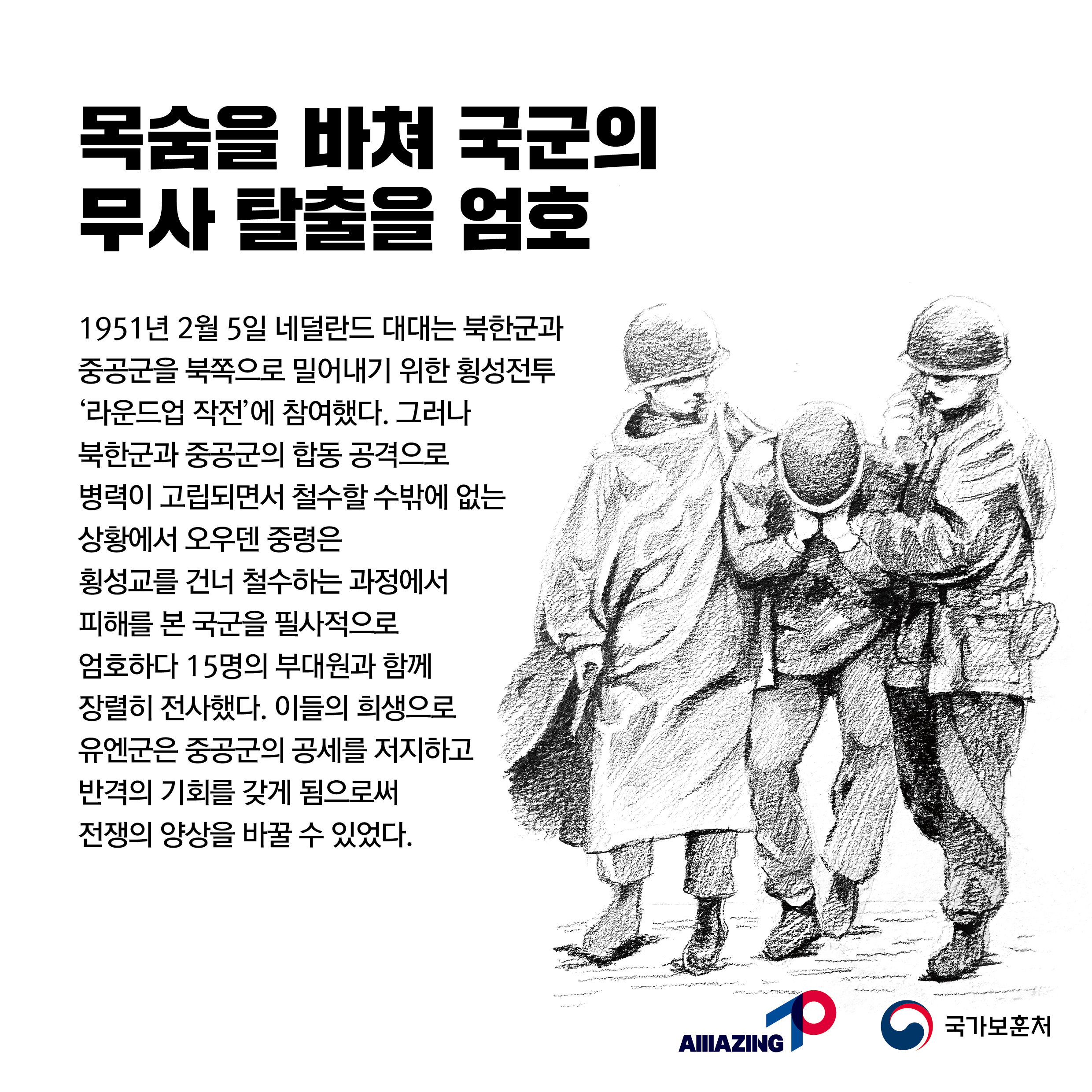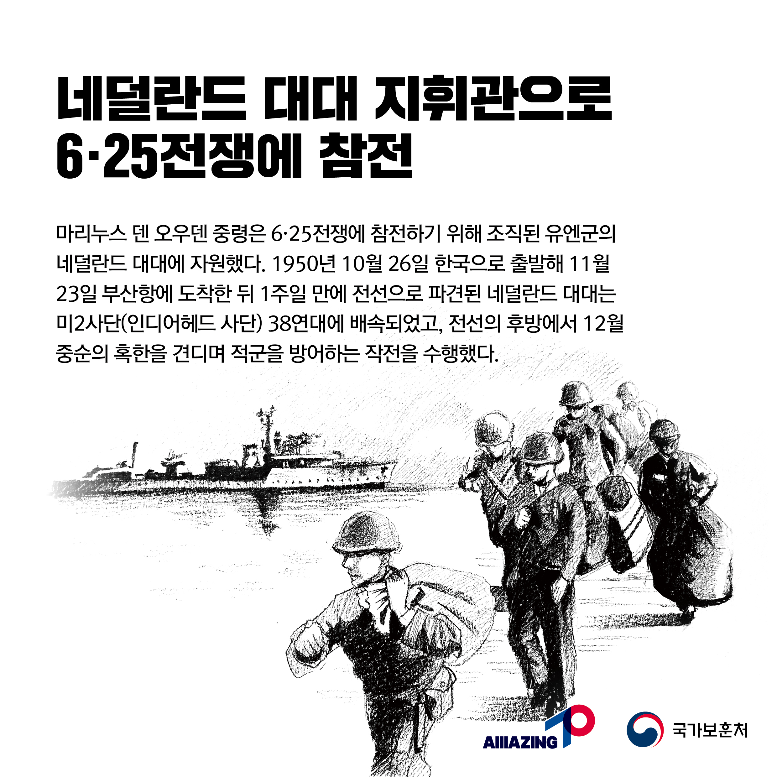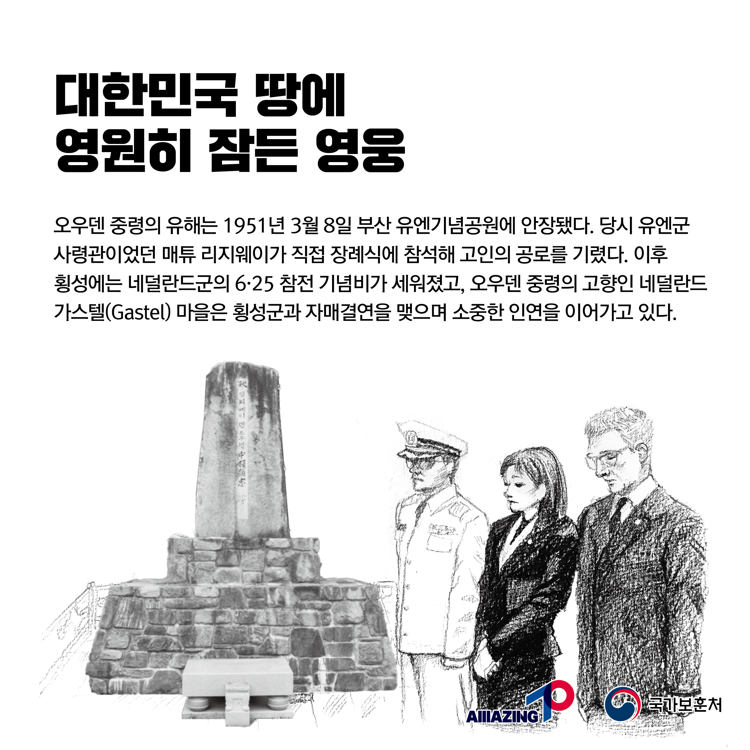 2023년 2월 세 번째 <리멤버 전쟁영웅 :6·25 역사를 바꾼 네덜란드 중령의 희생 마리누스 덴 오우덴 네덜란드 육군 중령 > 2월 세번 째,<6·25 역사를 바꾼 네덜란드 중령의 희생 : 마리누스 덴 오우덴 네덜란드 육군 중령> 입니다. 마리누스 덴 오우덴 네덜란드 육군 중령은 네덜란드 지휘관으로 1951년 2월 적군을 북쪽으로 밀어내기 위한 라운드업 작전에 참전하여 중공군의 대대적인 반격을 저지하며 전투를 지휘하던 중 횡성교를 건너 철수하는 과정에서 피해를 본 국군을 필사적으로 엄호하다 15명의 부대원과 함께 장렬히 전사하였습니다. 이들의 희생으로 유엔군은 중공군의 공세를 저지하고 반격의 기회를 갖게됨으로써 전쟁의 양상을 바꿀 수 있었습니다. 오우덴 중령의 유해는 1951년 3월 8일, 부산 유엔기념공원에 안장되어 있습니다. 6·25 역사를 바꾼 네덜란드 중령, 마리누스 덴 오우덴 중령을 기억해주세요.