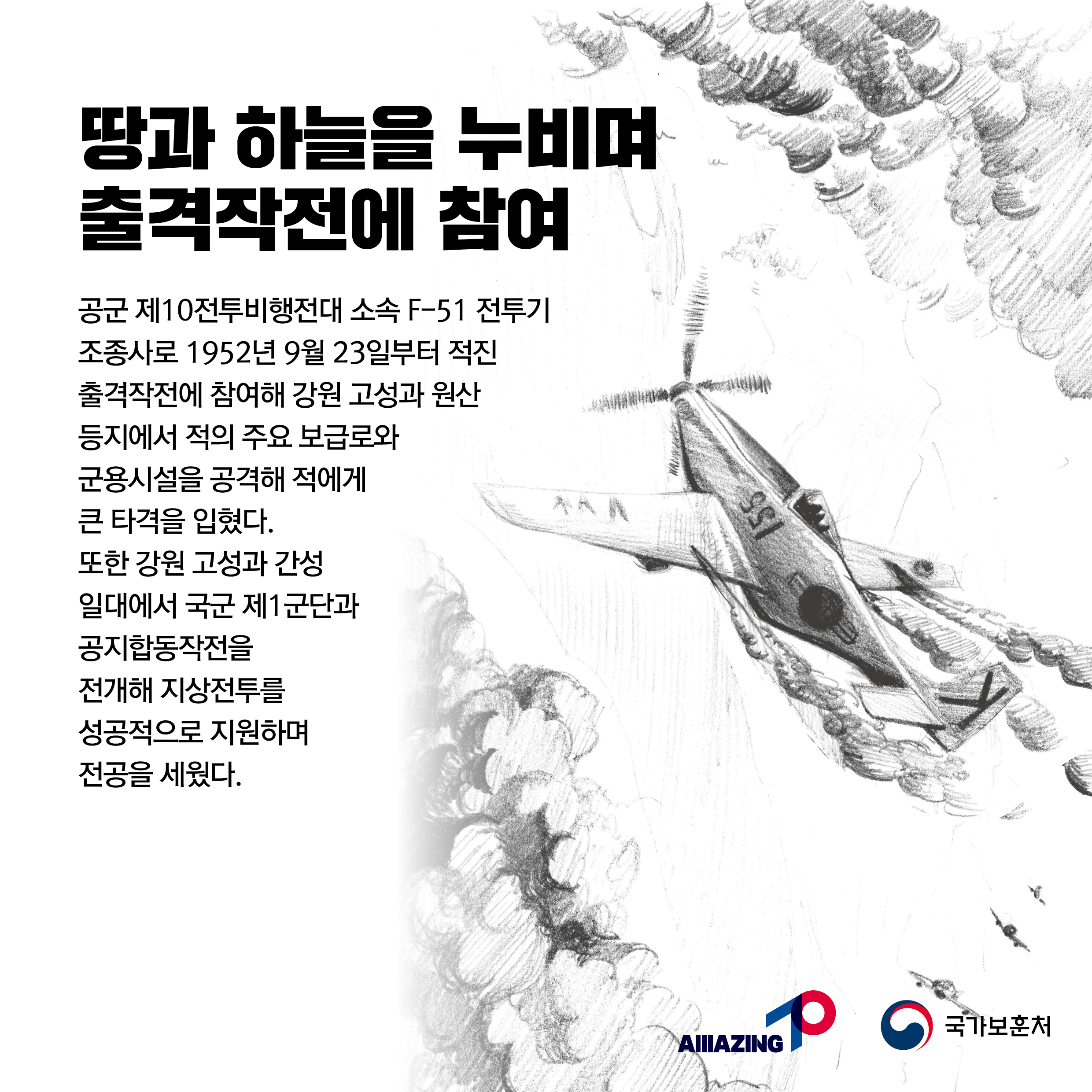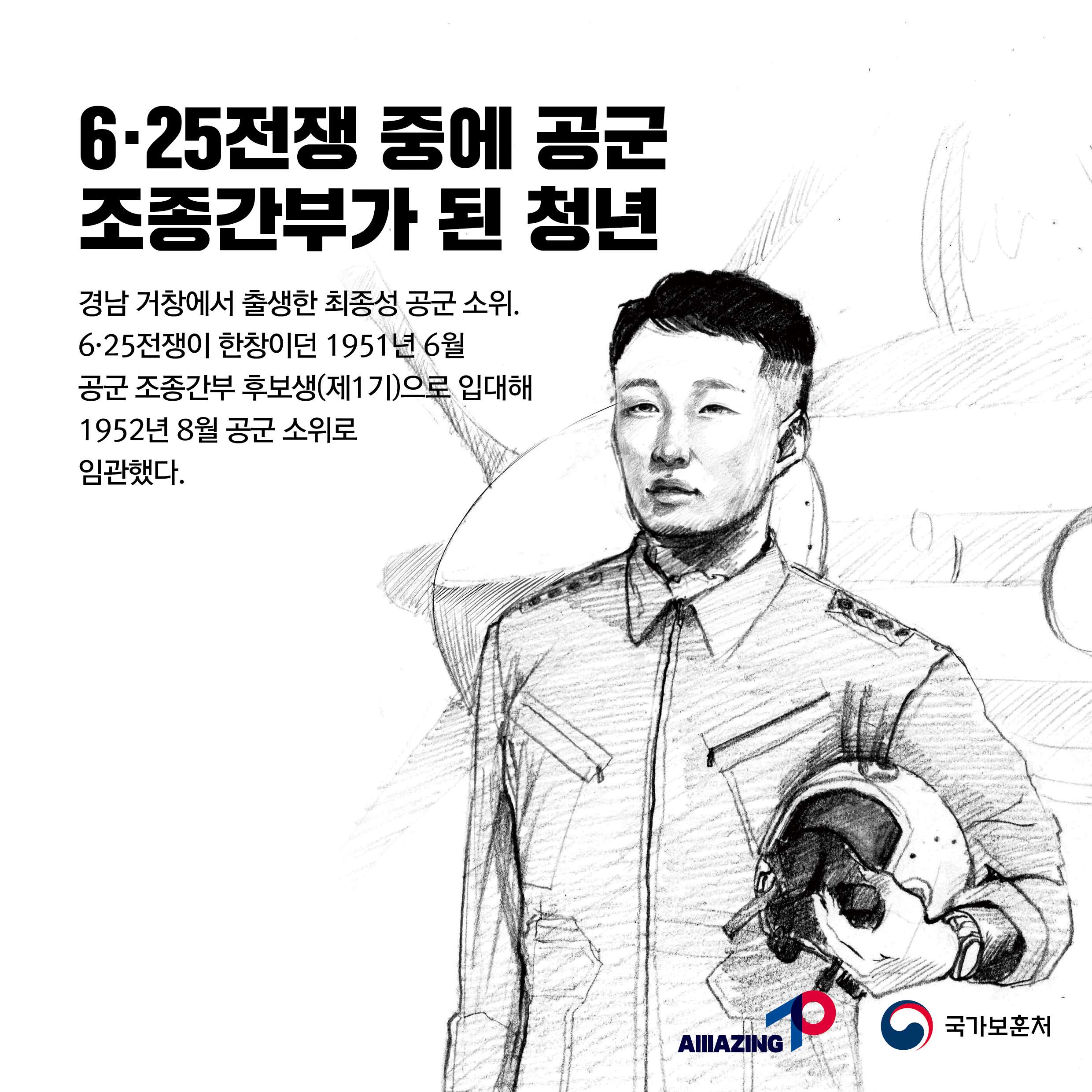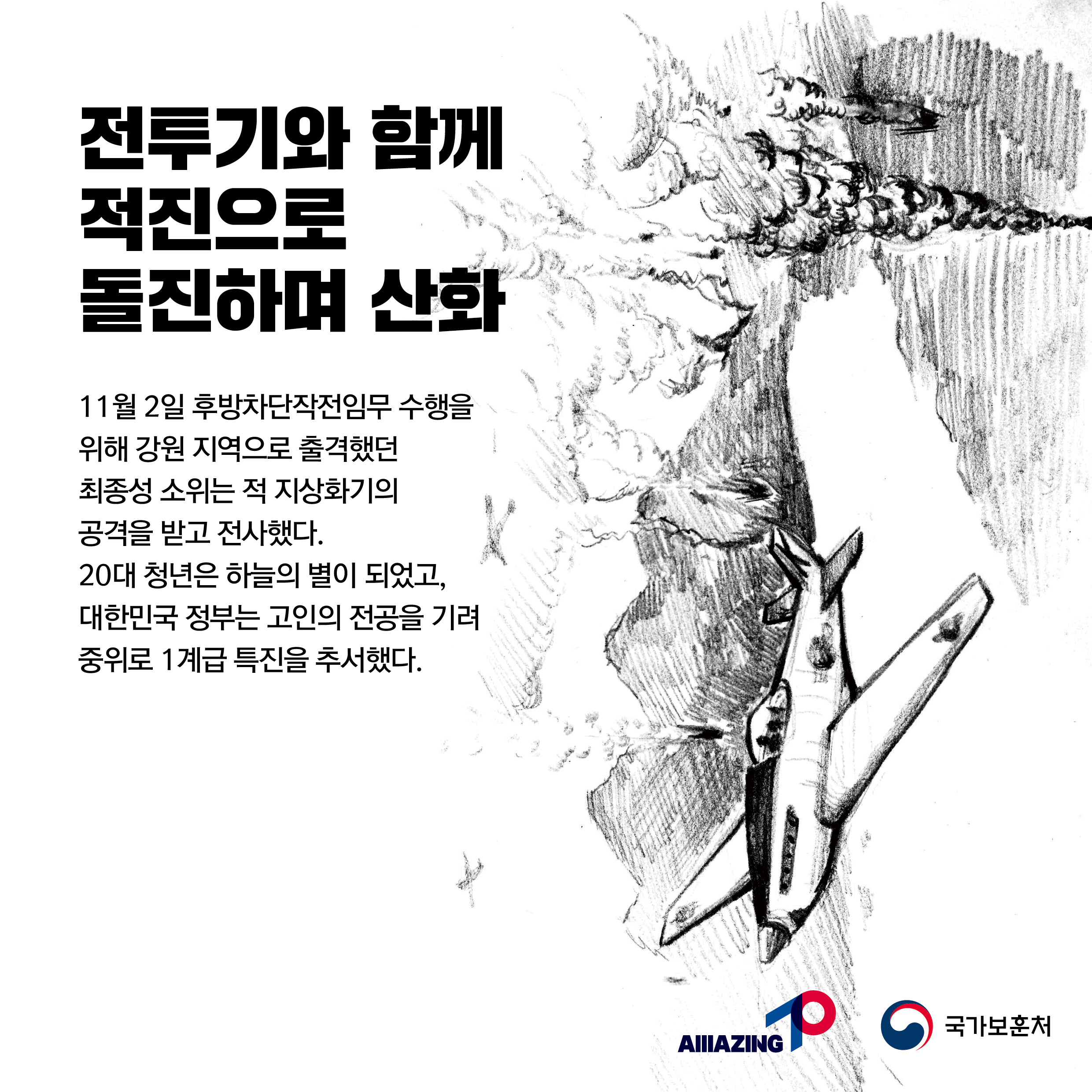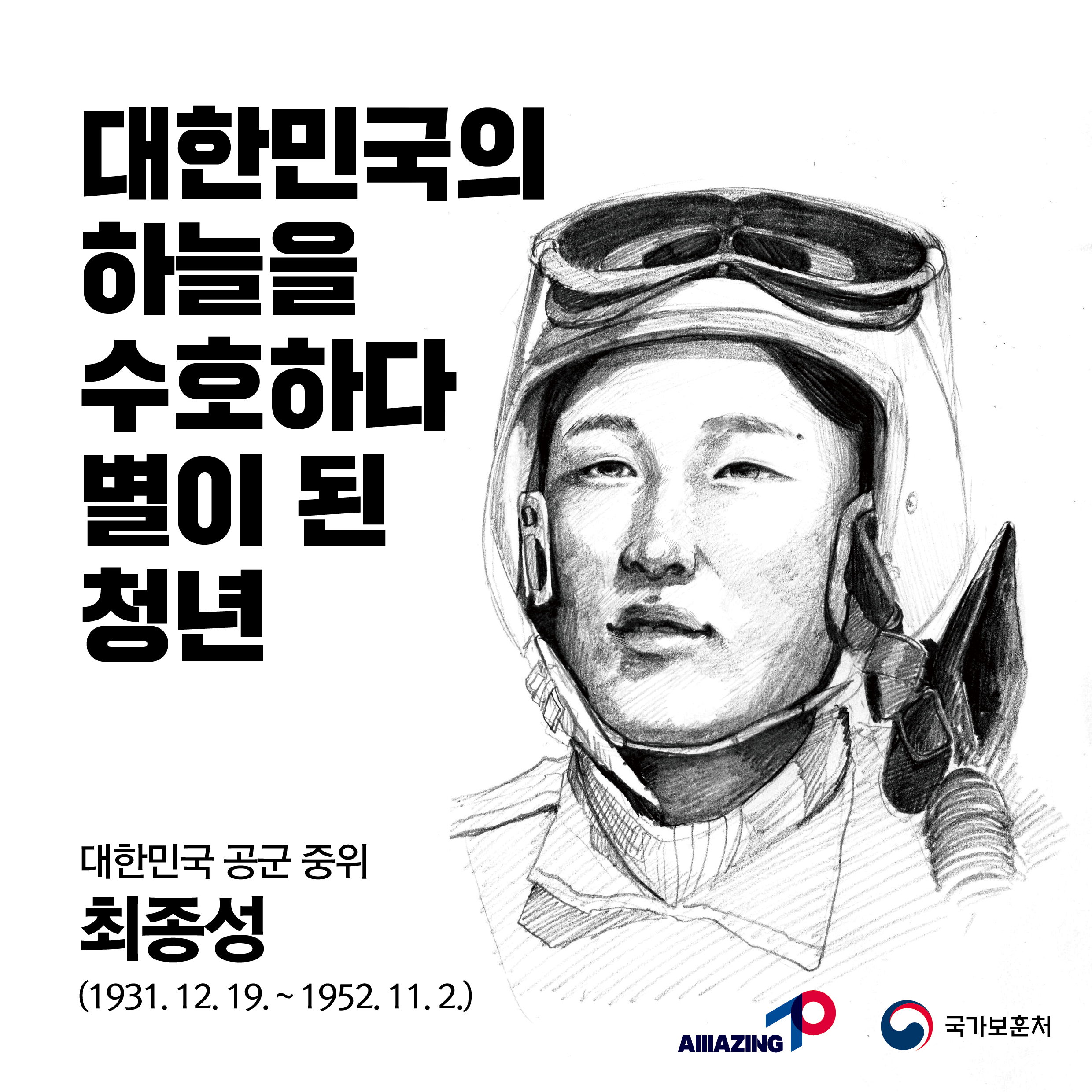 2023년 2월 첫 번째 <리멤버 전쟁영웅 : 대한민국의 하늘을 수호하다 별이 된 청년 최종성> 6·25전쟁 당시 위기에 빠진 대한민국을 위해 목숨걸고 자유와 평화를 수호한 영웅들이 있었습니다. 6·25전쟁 정전협정 70주년! 6·25전쟁영웅을 기억하는 <리멤버 6·25전쟁영웅>이야기가 2023년 매주 펼쳐집니다. 전쟁영웅의 용기와 활약을 리멤버, 기억해주십시오! 2월 첫 주,<리멤버 전쟁영웅 대한민국의 하늘을 수호하다 별이 된 청년 최종성> 입니다. 공군이었던 최종성 중위는 F-51 전투기 조종사로 고성, 원산 등 방면에서 적의 주요 보급로를 차단하고 병력 집결지와 군용시설을 공격하는 등의 전투 임무를 수행했고 후방차단작전 임무 수행을 위해 강원 원산 남쪽 안변지역으로 출격하였다가 적의 지상화기에 파탄되어 전사하였습니다. 대한민국 정부는 고인의 전공을 기려 중위로 1계급 특진을 추서하였습니다. 용감한 청년 최종성 중위를 기억합니다. ![]()