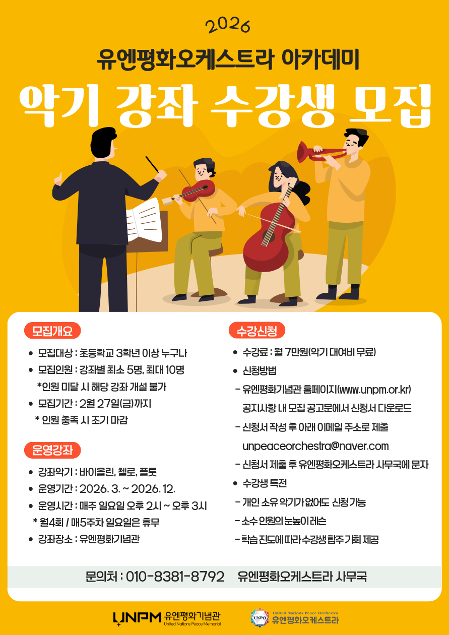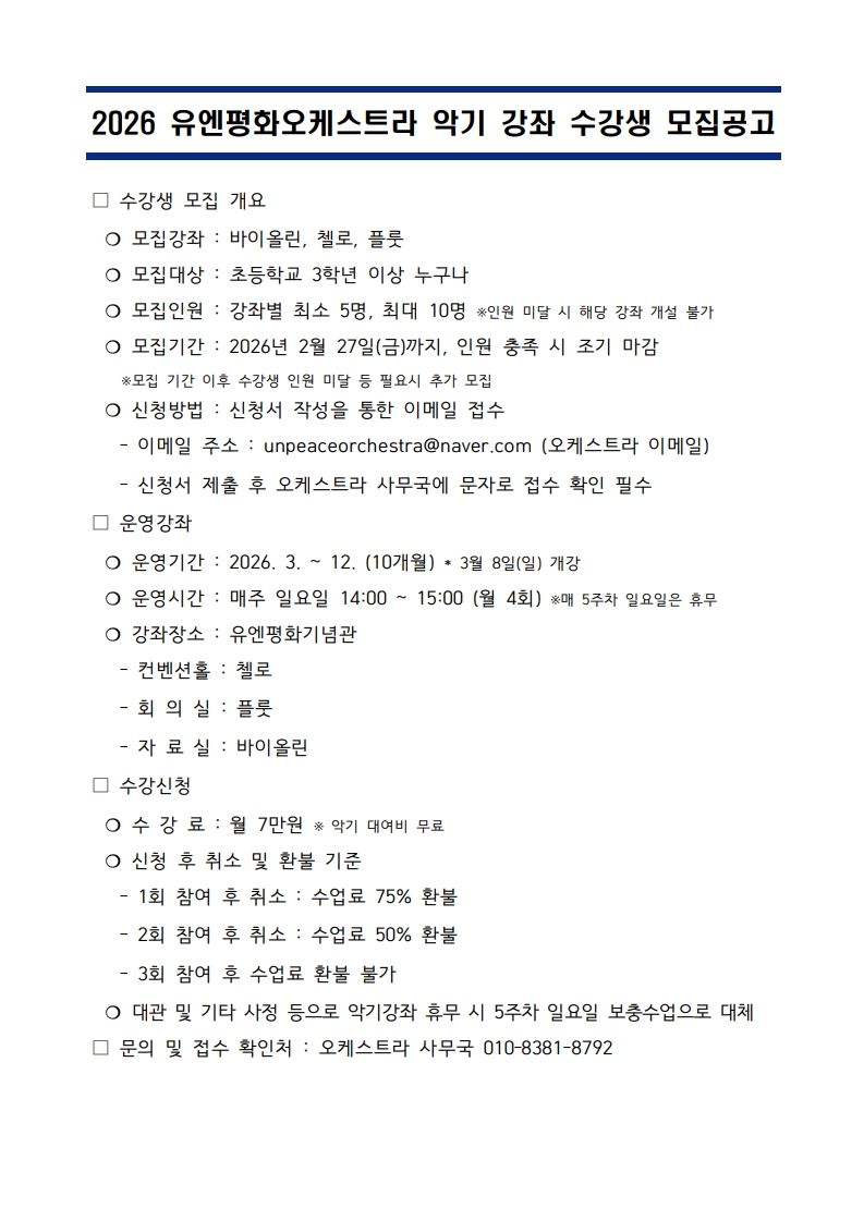 ■ 공지사항(2.27.) - 악기 강좌 수강 신청에 많은 관심 감사드립니다. - 악기 강좌 수강 신청은 2월 27일(금) 18시 기준으로 마감됩니다. - 악기 강좌 수강 신청해주신 분들을 대상으로 3월 8일(일)부터 강좌가 진행될 예정이며 악기 강좌에 대한 전반적인 전달 사항은 3월 1주 중으로 개별 휴대폰으로 일괄 안내(문자 메시지 등) 예정입니다.