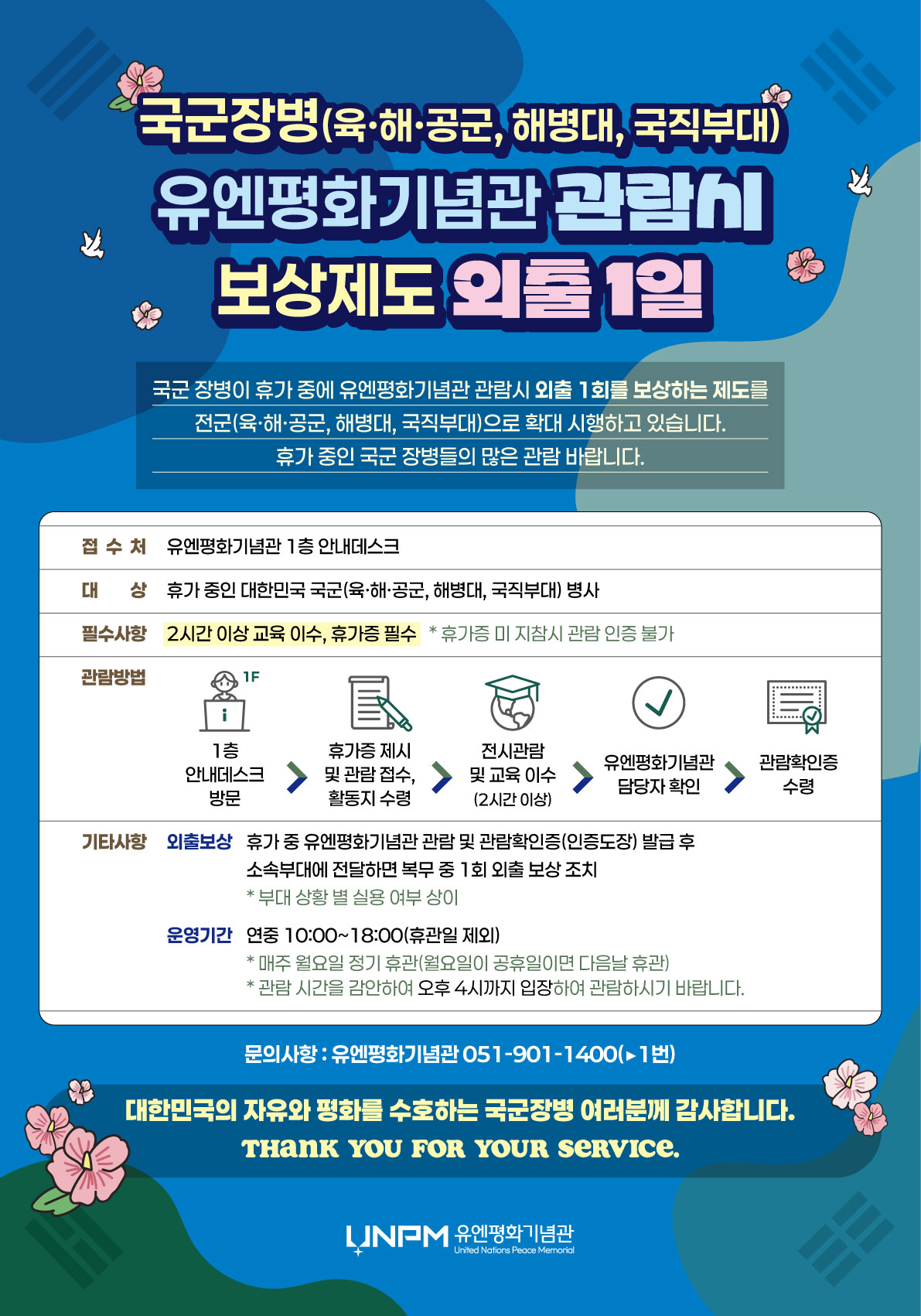 유엔평화기념관과 국방부는 국군 장병이 휴가 중 유엔평화기념관 관람 시 복무 기간 중 외출 1회를 보상하는 제도를 시행하고 있습니다. 휴가 중인 국군 장병의 많은 관람 바랍니다. 2. 대 상 : 휴가 중인 대한민국 국군 병사 (외출, 외박은 해당 사항 없음) 3. 관람필수사항 : 2시간 이상 관람(교육 이수), 휴가증 필수 * 휴가증 미지참시 관람 인증 불가 4. 관람 방법 > 유엔평화기념관 담당자 확인 > 관람확인증 수령 5. 기 타 사 항 - 관 람 일 : 정기 휴관일을 제외한 모든 요일 방문 가능 * 매주 월요일 정기 휴관(월요일이 연휴인 경우 연휴 다음날 휴관) |